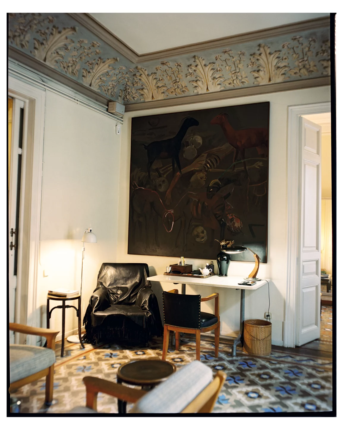 But her homes are works of art, too. “She was creating her own still life in every corner of every house,” says Palumbo. He points to one such vignette in the Barcelona apartment: four ordinary-looking Staffordshire dogs on a dresser, several crystal candlesticks between them and two yellow Chinese vases behind. Hanging overhead is a large gray fish painted by the Catalan artist Joan Gardy Artigas. “The dogs are kitsch—bad taste could be fantastic to her—but the composition of them here is just so elegant!” And so it is.